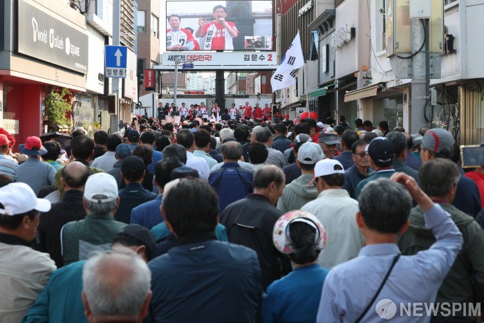 [서산=뉴스핌] 최지환 기자 = 김문수 국민의힘 대선 후보가 25일 충남 서산시 중앙통 로데오 거리에서 유세를 하고 있다. 2025.05.25 choipix16@newspim.com