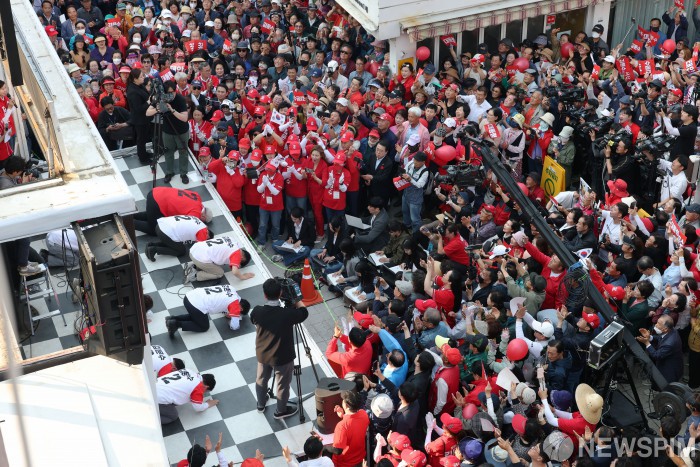 [서산=뉴스핌] 최지환 기자 = 김문수 국민의힘 대선 후보가 25일 충남 서산시 중앙통 로데오거리에서 유세를 하며 큰절 하고 있다. 2025.05.25 choipix16@newspim.com