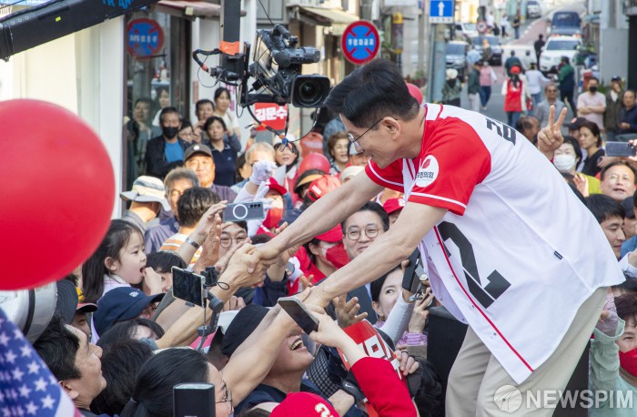 [서산=뉴스핌] 최지환 기자 =김문수 국민의힘 대선 후보가 13일 오후 충남 서산시 중앙통 로데오거리에서 시민들에게 지지를 호소하고 있다. 2025.05.25 choipix16@newspim.com