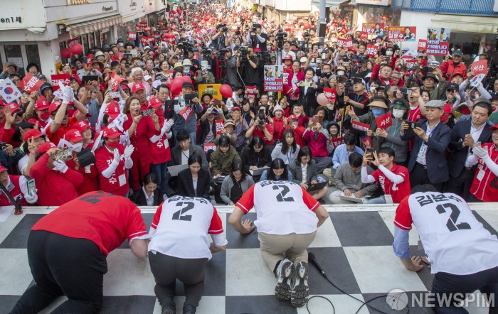 [서산=뉴스핌] 최지환 기자 =김문수 국민의힘 대선 후보가 13일 오후 충남 서산시 중앙통 로데오거리에서 시민들에게 지지를 호소하며 큰절을 하고 있다. 2025.05.25 choipix16@newspim.com