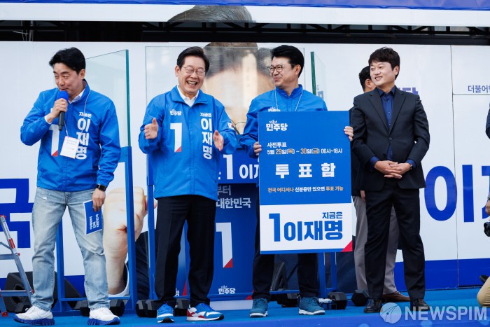 [아산=뉴스핌] 김학선 기자 = 이재명 더불어민주당 대선 후보가 25일 오후 충남 아산 한들물빛공원에서 열린 집중유세에서 투표 퍼포먼스를 하던 중 크게 웃고 있다. 2025.05.25 yooksa@newspim.com