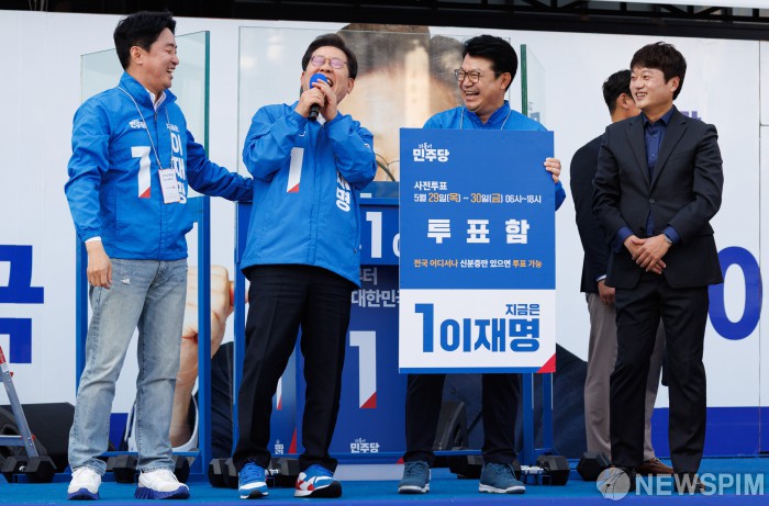 [아산=뉴스핌] 김학선 기자 = 이재명 더불어민주당 대선 후보가 25일 오후 충남 아산 한들물빛공원에서 열린 집중유세에서 투표 퍼포먼스를 하던 중 크게 웃고 있다. 2025.05.25 yooksa@newspim.com