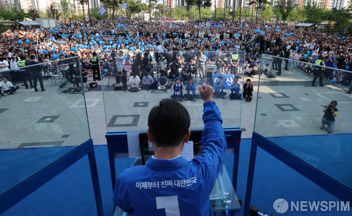 [아산=뉴스핌] 김학선 기자 = 이재명 더불어민주당 대선 후보가 25일 충남 아산 탕정역 한들물빛공원에서 열린 유세에서 연설하고 있다. 2025.05.25 yooksa@newspim.com