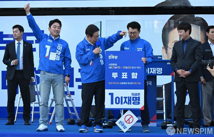 [아산=뉴스핌] 김학선 기자 = 이재명 더불어민주당 대선후보가 25일 오후 충남 아산시 탕정 한들물빛공원에서 열린 집중유세에서 사전투표 독려 퍼포먼스를 하고 있다. 2025.05.25 yooksa@newspim.com