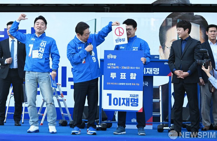 [아산=뉴스핌] 김학선 기자 = 이재명 더불어민주당 대선후보가 25일 오후 충남 아산시 탕정 한들물빛공원에서 열린 집중유세에서 사전투표 독려 퍼포먼스를 하고 있다. 2025.05.25 yooksa@newspim.com