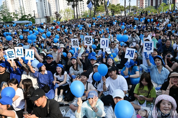 [아산=뉴스핌] 김학선 기자 = 25일 오후 충남 아산시 탕정 한들물빛공원에서 열린 이재명 더불어민주당 대선후보의 유세에서 지지자들이 환호하고 있다. 2025.05.25 yooksa@newspim.com