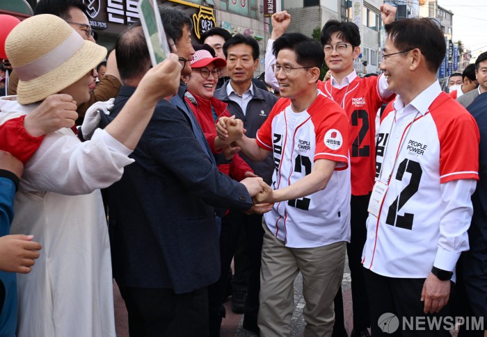 [당진=뉴스핌] 최지환 기자 = 김문수 국민의힘 대선 후보가 25일 충남 당진시장 오거리에서 유세를 하며 지지자들과 인사를 나누고 있다. 2025.05.25 choipix16@newspim.com