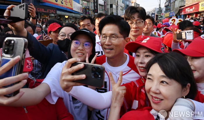 [당진=뉴스핌] 최지환 기자 = 김문수 국민의힘 대선 후보가 25일 충남 당진시장 오거리에서 유세를 하며 지지자들과 사진을 찍고 있다. 2025.05.25 choipix16@newspim.com