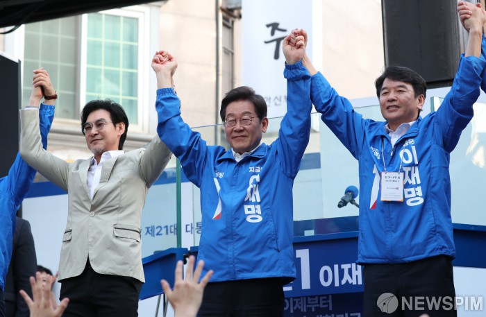 [천안=뉴스핌] 김학선 기자 = 더불어민주당 이재명 대선 후보가 25일 오후 충남 천안 신부문화거리 유세장에서 유권자들의 지지를 호소하고 있다.2025.05.25 yooksa@newspim.com
