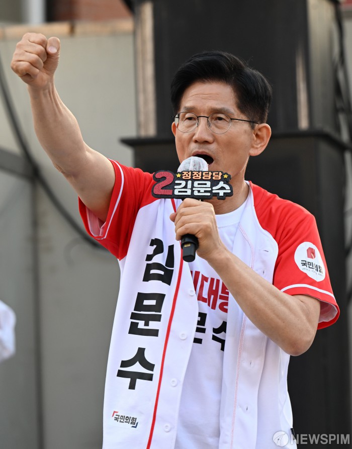 [당진=뉴스핌] 최지환 기자 = 김문수 국민의힘 대선후보가 25일 충남 당진시장에서 선거 유세를 하고 있다. 2025.05.25 choipix16@newspim.com