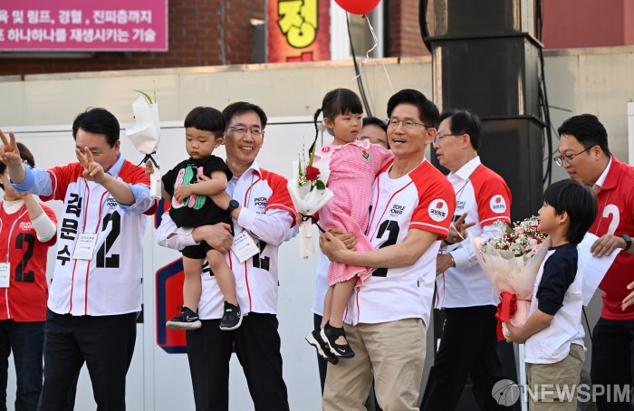 [당진=뉴스핌] 최지환 기자 = 김문수 국민의힘 대선후보가 25일 충남 당진시장에서 선거 유세를 하며 꽃을 들고 온 한 아이를 안고 있다. 2025.05.25 choipix16@newspim.com