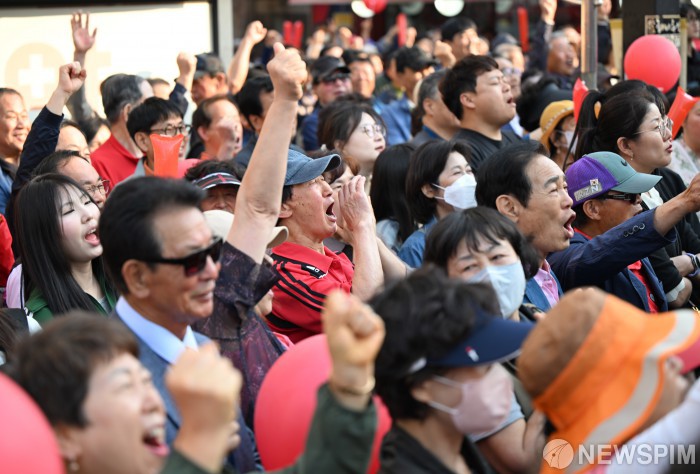 [당진=뉴스핌] 최지환 기자 = 김문수 국민의힘 대선후보 지지자들이 25일 충남 당진시장에서 김 후보를 외치고 있다. 2025.05.25 choipix16@newspim.com