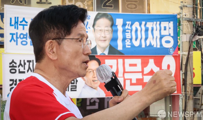 [당진=뉴스핌] 최지환 기자 = 김문수 국민의힘 대선 후보가 25일 충남 당진시장 오거리에서 열린 유세에서 지지를 호소하고 있다. 2025.05.25 choipix16@newspim.com