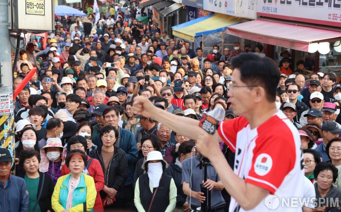 [당진=뉴스핌] 최지환 기자 = 김문수 국민의힘 대선 후보가 25일 충남 당진시장 오거리에서 열린 유세에서 지지를 호소하자 시민들이 지켜보고 있다. 2025.05.25 choipix16@newspim.com