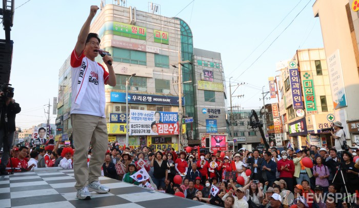 [당진=뉴스핌] 최지환 기자 = 김문수 국민의힘 대선 후보가 25일 충남 당진시장 오거리에서 열린 유세에서 지지를 호소하고 있다. 2025.05.25 choipix16@newspim.com
