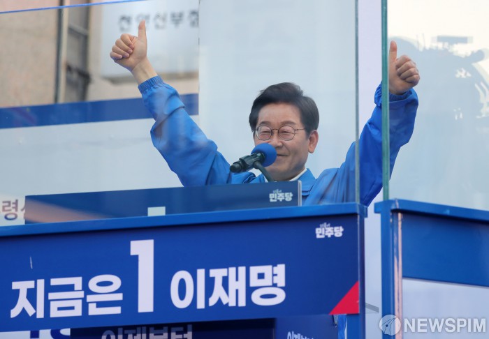 [천안=뉴스핌] 김학선 기자 =더불어민주당 이재명 대선 후보가 25일 오후 충남 천안 신부문화거리 유세장에서 연설을 마친 뒤 지지를 호소하며 포즈를 취하고 있다.2025.05.25 yooksa@newspim.com