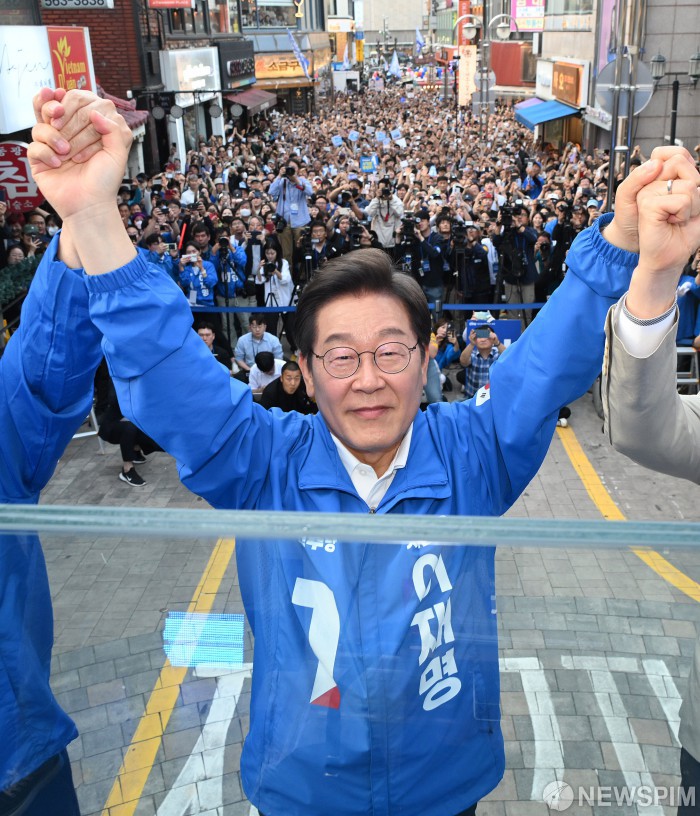 천안 시민들 향해 지지 호소하는 이재명 더불어민주당 대선 후보