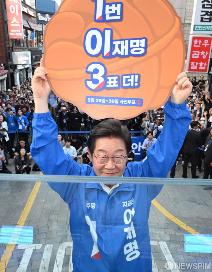 [천안=뉴스핌] 김학선 기자 = 이재명 더불어민주당 대선 후보가 25일 충남 천안시 동남구 신부문화거리에서 연설에 앞서 1·2·3(기호1번·이재명·3표 더) 퍼포먼스를 하고 있다. 2025.05.25 yooksa@newspim.com