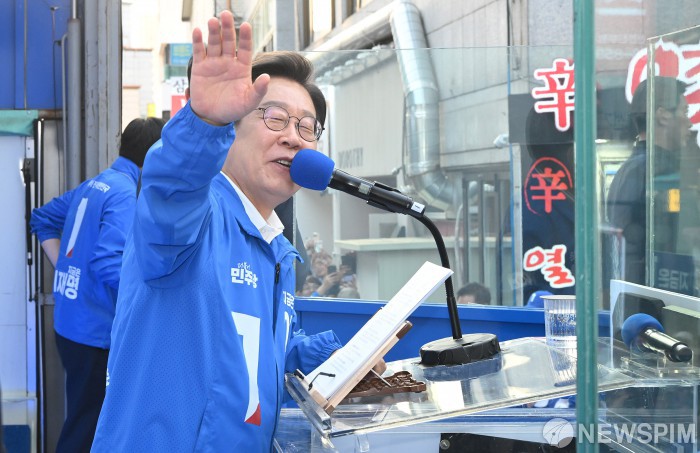 [천안=뉴스핌] 김학선 기자 = 이재명 더불어민주당 대선 후보가 25일 충남 천안시 동남구 신부문화거리에서 지지를 호소하고 있다. 2025.05.25 yooksa@newspim.com
