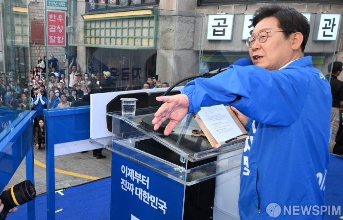 [천안=뉴스핌] 김학선 기자 = 이재명 더불어민주당 대선 후보가 25일 충남 천안시 동남구 신부문화거리에서 지지를 호소하고 있다. 2025.05.25 yooksa@newspim.com