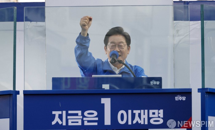 [천안=뉴스핌] 김학선 기자 = 이재명 더불어민주당 대선후보가 25일 오후 충남 천안시 신부문화거리에서 연설을 하고 있다. 2025.05.25 yooksa@newspim.com