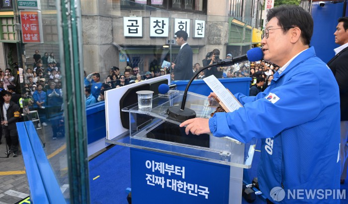 [천안=뉴스핌] 김학선 기자 = 이재명 더불어민주당 대선 후보가 25일 충남 천안시 동남구 신부문화거리에서 지지를 호소하고 있다. 2025.05.25 yooksa@newspim.com