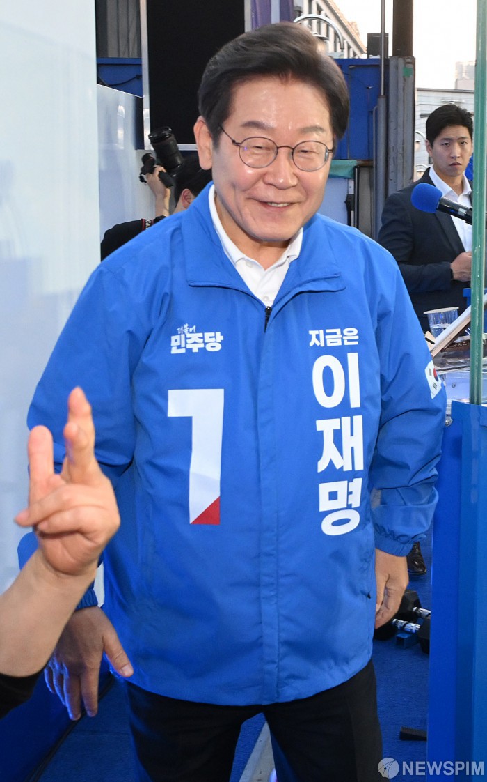 [천안=뉴스핌] 김학선 기자 = 이재명 더불어민주당 대선 후보가 25일 충남 천안시 동남구 신부문화거리에서 지지를 호소한 뒤 시민들에게 향하고 있다. 2025.05.25 yooksa@newspim.com