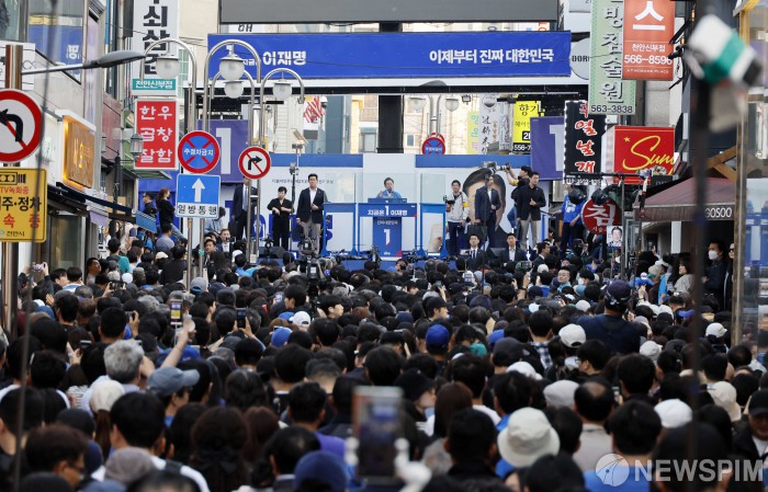 [천안=뉴스핌] 김학선 기자 = 이재명 더불어민주당 대선후보가 25일 오후 충남 천안시 신부문화거리에서 연설을 하고 있다. 2025.05.25 yooksa@newspim.com