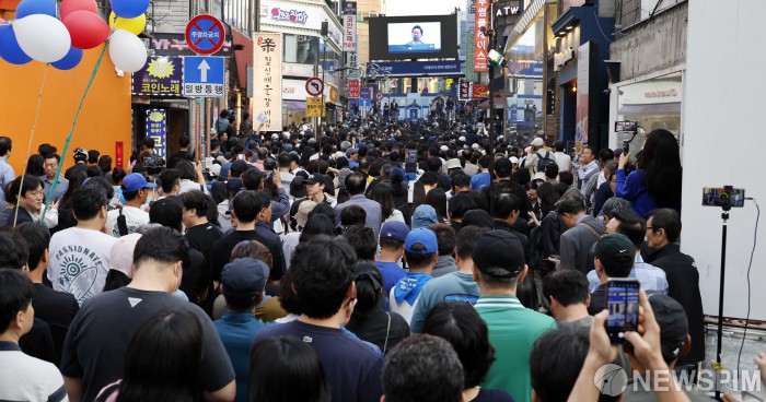 [천안=뉴스핌] 김학선 기자 = 이재명 더불어민주당 대선후보가 25일 오후 충남 천안시 신부문화거리에서 연설을 하고 있다. 2025.05.25 yooksa@newspim.com