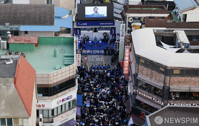 골목속 연설하는 천안의 이재명 후보