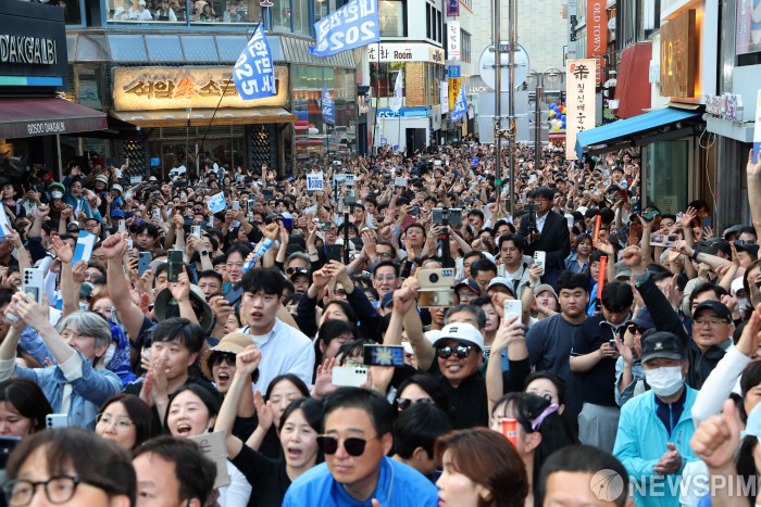 [천안=뉴스핌] 김학선 기자 = 25일 충남 천안시 신부문화거리에서 지지자들이 이재명 더불어민주당 대선후보의 연설에 환호하고 있다. 2025.05.25 yooksa@newspim.com