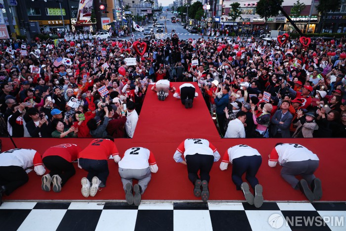 [아산=뉴스핌] 김학선 기자 = 김문수 국민의힘 대선후보가 25일 저녁 충남 아산시 온양온천역에서 열린 선거유세에서 큰절을 하고 있다. 2025.05.25 yooksa@newspim.com