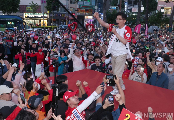 [아산=뉴스핌] 김학선 기자 = 김문수 국민의힘 대선후보가 25일 저녁 충남 아산시 온양온천역에서 열린 선거유세에서 연설하고 있다. 2025.05.25 yooksa@newspim.com