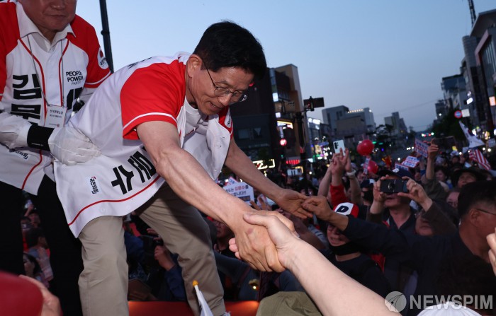 [아산=뉴스핌] 김학선 기자 = 김문수 국민의힘 대선후보가 25일 저녁 충남 아산시 온양온천역에서 열린 선거유세에서 연설을 마치고 지지자들과 악수하고 있다. 2025.05.25 yooksa@newspim.com