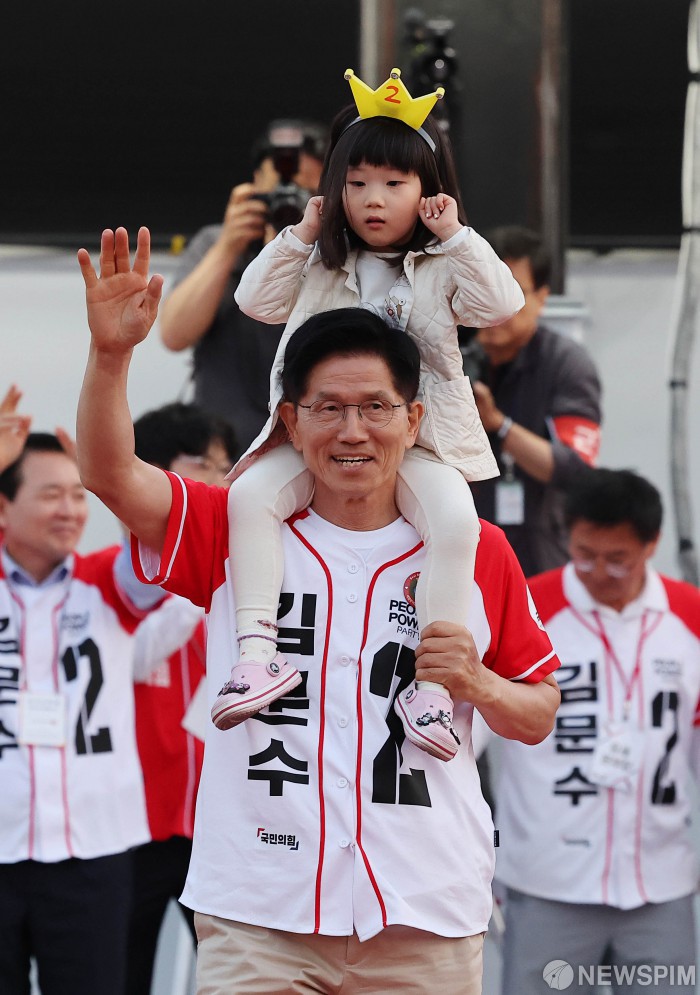 [아산=뉴스핌] 최지환 기자 = 김문수 국민의힘 대선 후보가 25일 오후 충남 아산시 온양온천역 앞 광장에서 열린 ‘기적으로 만들 진짜 아산’ 유세에서 한 어린이를 목마를 태우고 무대로 나오고 있다. 2025.05.25 choipix16@newspim.com
