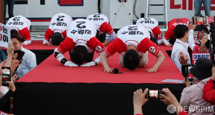 [아산=뉴스핌] 최지환 기자 = 김문수 국민의힘 대선 후보가 25일 오후 충남 아산시 온양온천역 앞 광장에서 열린 ‘기적으로 만들 진짜 아산’ 유세에서 큰절을 하고 있다. 2025.05.25 choipix16@newspim.com