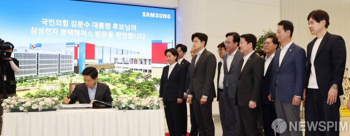 [평택=뉴스핌] 최지환 기자 = 김문수 국민의힘 대선후보가 26일 오후 경기 평택시 삼성전자 평택캠퍼스를 찾아 방명록을 작성하고 있다. 2025.05.26 choipix16@newspim.com