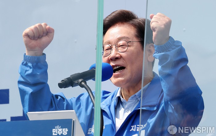 [용인=뉴스핌] 정일구 기자 = 이재명 더불어민주당 대선 후보가 26일 오후 경기 용인시 단국대 죽전캠퍼스 정문 앞에서 열린 용인 유세에서 연설을 하며 주먹을 쥐어 보이고 있다. 2025.05.26 mironj19@newspim.com