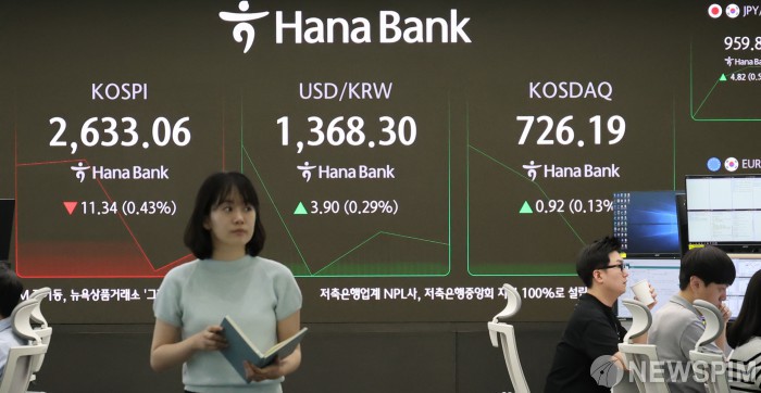 [서울=뉴스핌] 양윤모 기자 = 27일 오전 코스피가 전장 종가보다 11.34포인트(0.43%) 하락하며 2,633.06으로, 코스닥은 0.92포인트(0.13%) 상승한 726.19로 장을 시작한 가운데, 서울 중구 하나은행 딜링룸에서 직원들이 업무를 보고 있다. 서울외환시장에서 원·달러 환율은 전장 대비 3.90원 상승한 1,368.30원에 거래를 시작했다. 2025.05.27 yym58@newspim.com