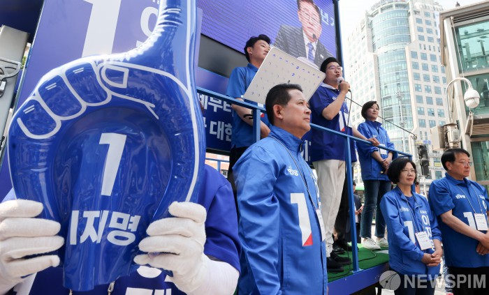 [서울=뉴스핌] 최지환 기자 = 박찬대 더불어민주당 상임총괄선거대책위원장이 27일 오전 서울 중구 동묘앞역에서 열린 유세 현장에서 이재명 대선 후보의 지지를 호소하고 있다. 2025.05.27 choipix16@newspim.com