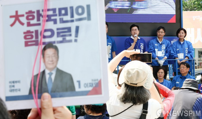 [서울=뉴스핌] 최지환 기자 = 박찬대 더불어민주당 상임총괄선거대책위원장이 27일 오전 서울 중구 동묘앞역에서 열린 유세 현장에서 이재명 대선 후보의 지지를 호소하고 있다. 2025.05.27 choipix16@newspim.com