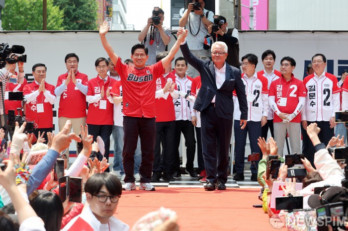 [부산=뉴스핌] 최지환 기자 = 김문수 국민의힘 대선 후보가 28일 오후 부산 진구 쥬디스태화 백화점 앞 유세장에서 정의화 전 국회의장과 함께 지지자들에게 인사를 하고 있다. 2025.05.28 choipix16@newspim.com