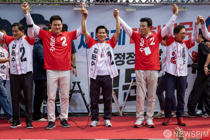 [양산=뉴스핌] 최지환 기자 = 김문수 국민의힘 대선 후보가 28일 오후 경남 양산시 이마트 양산점 앞에서 열린 필승으로 이어질, 양산의 함성 유세에서 시민들에게 지지를 호소하고 있다. 2025.05.28 choipix16@newspim.com