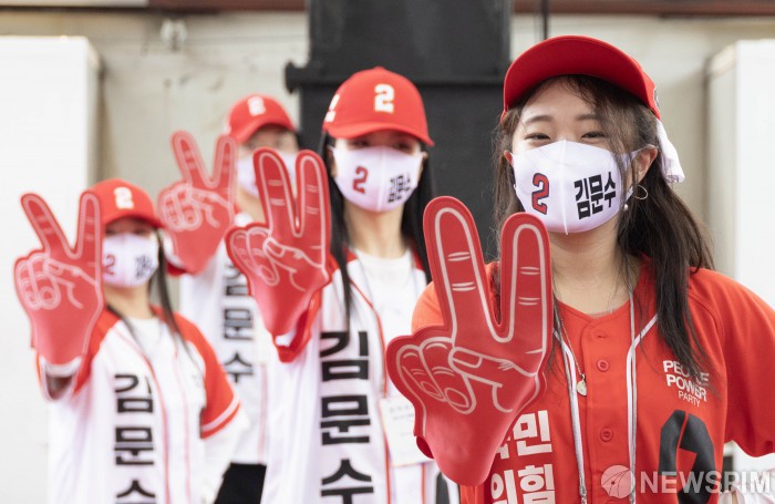 [경산=뉴스핌] 최지환 기자 = 28일 오후 경북 경산시 경산공설시장에서 열린 김문수 국민의힘 대선후보 유세현장에서 선거운동원들이 안무를 펼치고 있다. 2025.05.28 choipix16@newspim.com