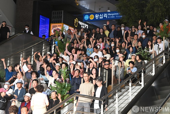 [서울=뉴스핌] 정일구 기자 = 28일 서울 성동구 왕십리역광장에서 열린 이재명 더불어민주당 대선후보의 유세현장을 찾은 지지자들이 인근 건물 계단에 앉아 후보자 연설을 경청하고 있다. 2025.05.28 mironj19@newspim.com