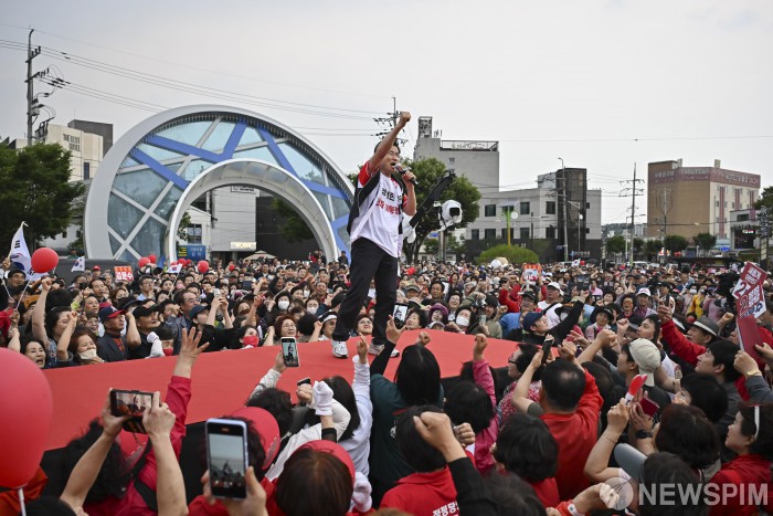 [영천=뉴스핌] 최지환 기자 = 김문수 국민의힘 대선 후보가 28일 오후 경북 영천시 영천역 앞 광장에서 열린 유세에서 지지를 호소하고 있다. 2025.05.28 choipix16@newspim.com