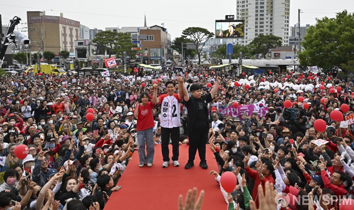 [영천=뉴스핌] 최지환 기자 = 김문수 국민의힘 대선 후보가 28일 오후 경북 영천시 영천역 앞 광장에서 열린 유세에서 지지를 호소하고 있다. 2025.05.28 choipix16@newspim.com
