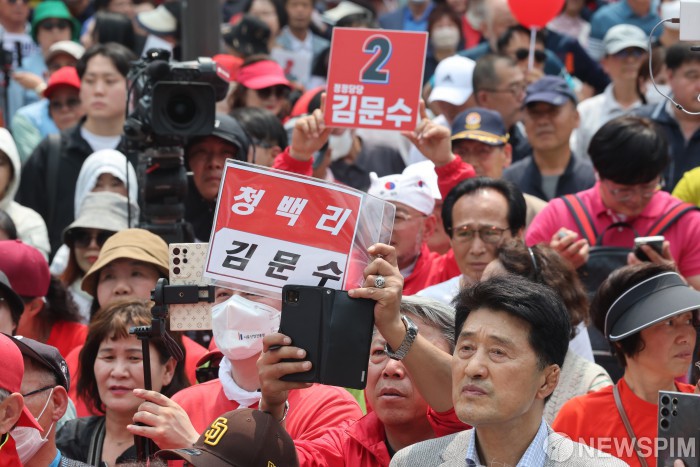 [시흥=뉴스핌] 최지환 기자 = 29일 오후 경기 시흥 삼미시장 앞 김문수 국민의힘 후보 유세장에서 지지자들이 김 후보를 응원하고 있다. 2025.05.29 choipix16@newspim.com