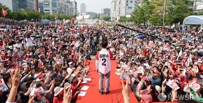 [안산=뉴스핌] 최지환 기자 = 김문수 국민의힘 대선 후보가 29일 오후 경기도 안산시 단원구 안산문화광장에서 열린 유세에서 지지를 호소하고 있다. 2025.05.29 choipix16@newspim.com