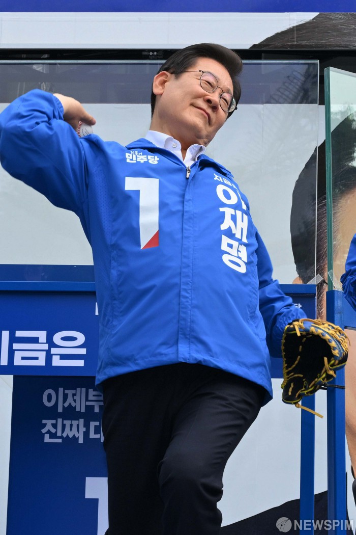 [서울=뉴스핌] 정일구 기자 = 이재명 더불어민주당 대선 후보가 29일 오후 서울 송파구 잠실야구장 앞에서 시구 퍼포먼스를 하고 있다. 2025.05.29 mironj19@newspim.com